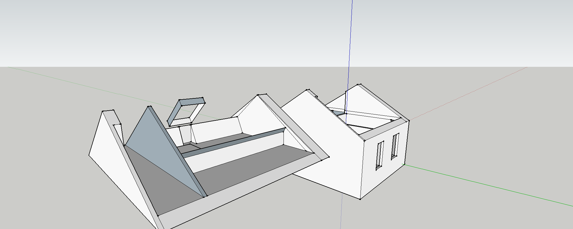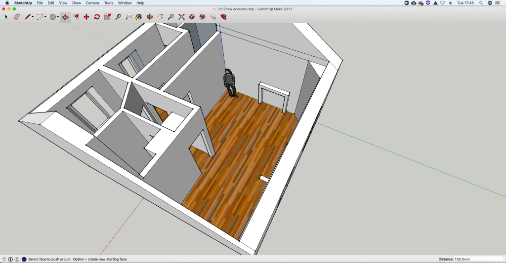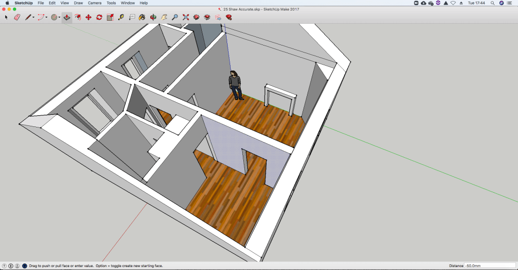 The really fun thing about SketchUp, particularly compared to some of the other things I’ve played with, it how easy it is to modify a model. Select a wall, push it and boom, gone!