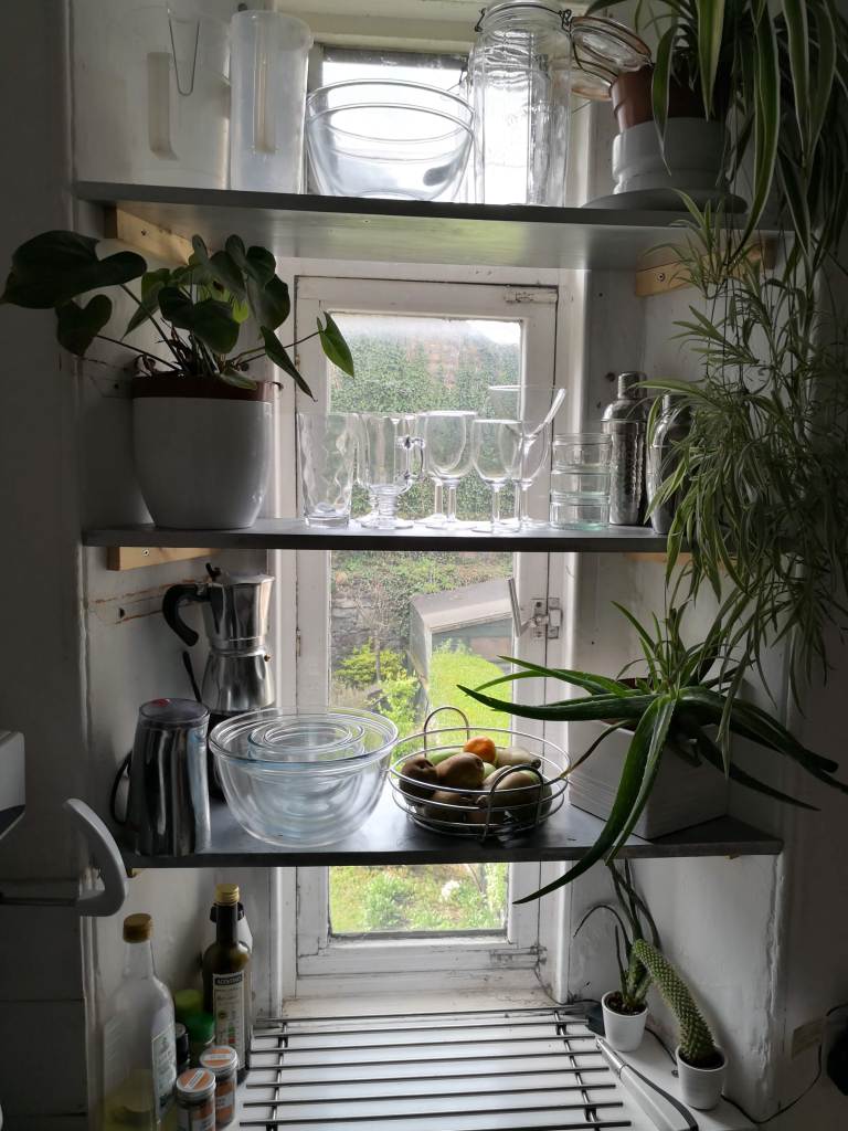 Don’t get me wrong, there are elements I like. I’m SO glad there’s a window. I don’t think I could easily live without a kitchen where I can see light from – I’d always rather have a bijou windowed kitchen than a bigger internal one. I LOVE the grill – it makes the best toast I’ve ever known, even better than Aga toast. I enjoy hanging things from hooks, using the height. I even find the VERY rough shelves I shoved in the window, kind of as a joke, quite funny. Because what’s cooler than laughing at one’s own?