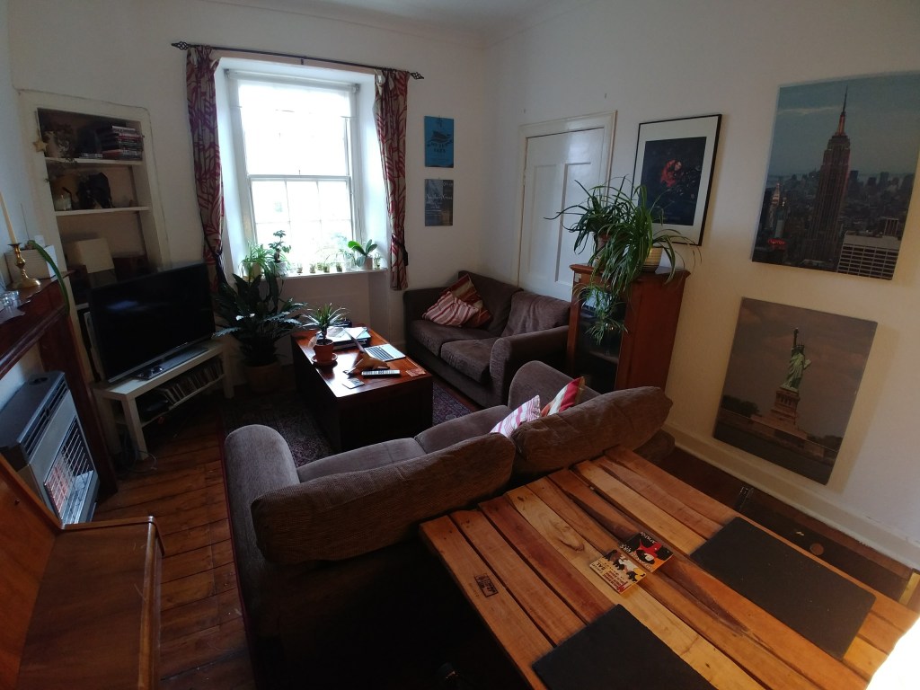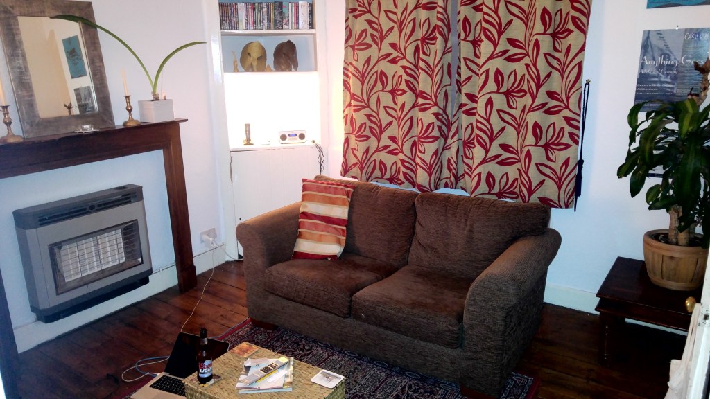 I had the 2 couches facing each other, in Ls, lots of places over 3 years or so, but it never quite worked – I was always tripping on them. Eventually, opportunity struck – new job, more money, and 2 couches had a new spot in Dundee. After a good bit of exploring, I found a single sofa I loved at Sofology. I was going to get an L-shaped one (is that a sectional in American?) but the sales person talked me into getting couch and footstool. It turned out to be the right choice, so thanks! In the slides below you can see 2 couches, old red couch playing stand-in (feat. coffee table as new footstool!) and the newer one. Much better!