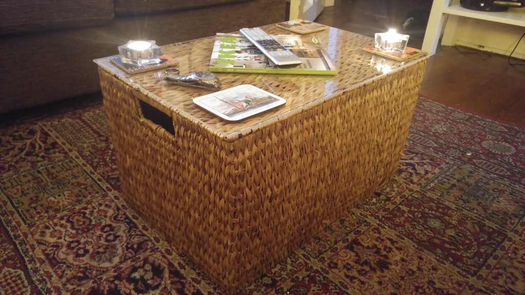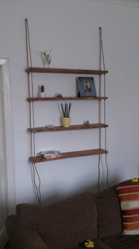 Early changes came in the form of a pair of couches, kind of being foisted on me in a complicated family arrangement from a now-ex. They were nice couches, but somehow 2 medium sized ones took up SO MUCH SPACE. They were always a bit of a faff, but they were there, comfy, and money wasn’t that free. You’ll also see I had a couple of coffee tables (one of which was actually a coffee table!) and one real pride of my early projects – my shelves! I made them from a randomly shaped but really pretty bit of worktop that had been lurking in the shed. Took a weekend, had lots of fun! 5 years on, they’ve stayed up – phew!