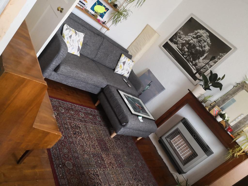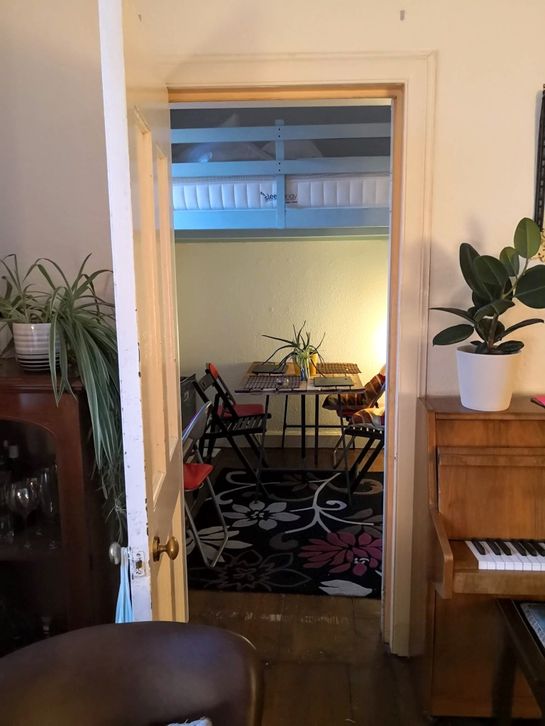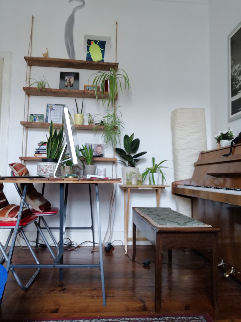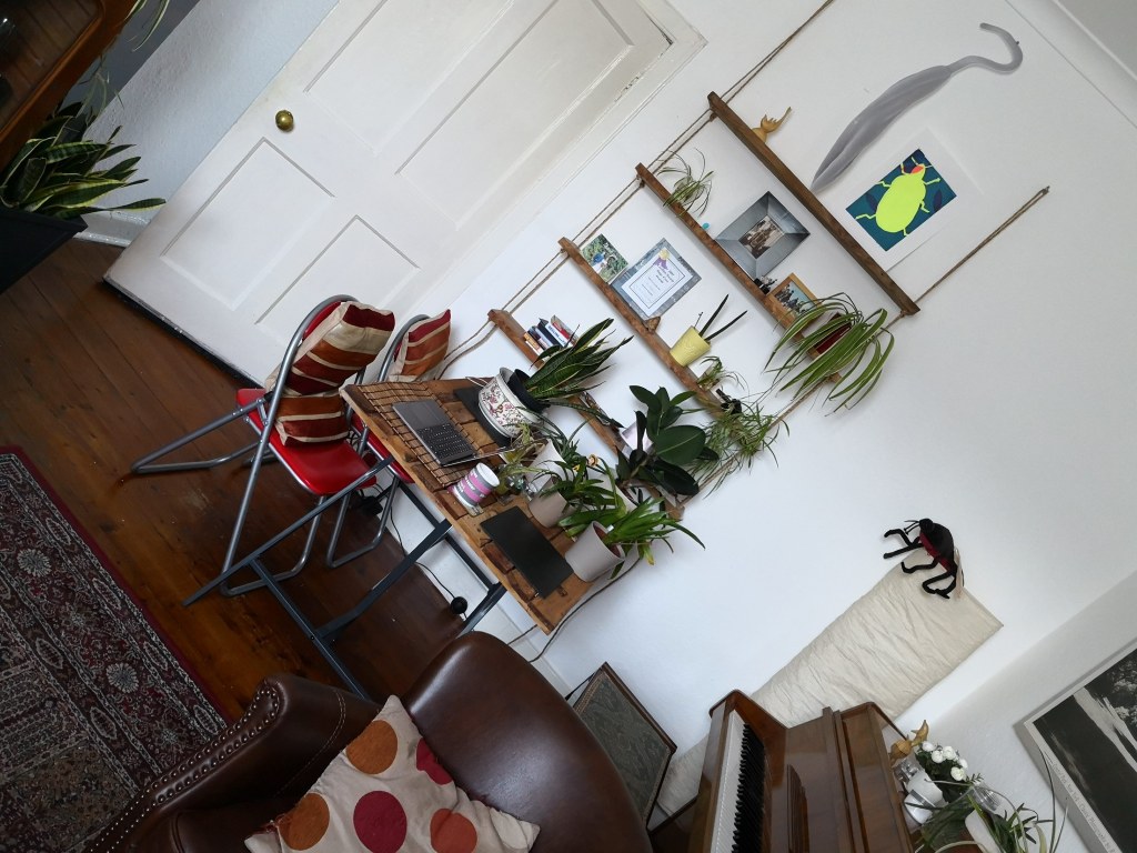 Speaking of the dining table, isn’t it fun? I got it at the same time as my bed pallets, but it was years later I finally thought to sand and varnish it up properly. You might also see it sitting wedged in between couch. As with seating, I tried it several ways over the years. It was always a bit of a faff there, though. I did have a moment of realising I’d been stupid by having seats crammed in next to the piano stool, when I could just use stool. Oy.